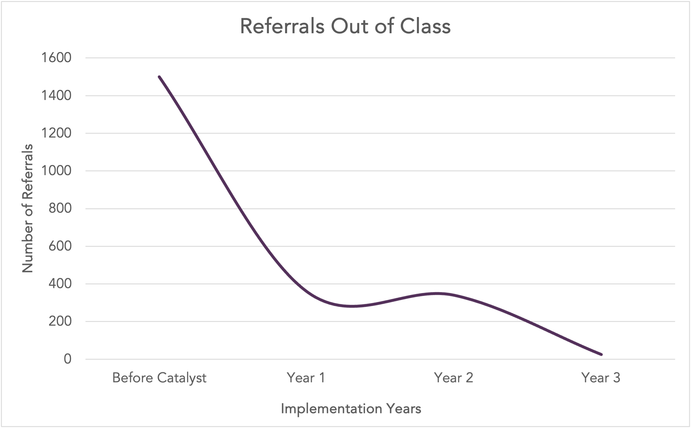 In a school with approximately 400 total students, the number of referrals in the year prior to Catalyst Implementation was close to 1,600. When launching Catalyst implementation, no policies for referring students changed, but the number of referrals dropped to only 25 by the third year.